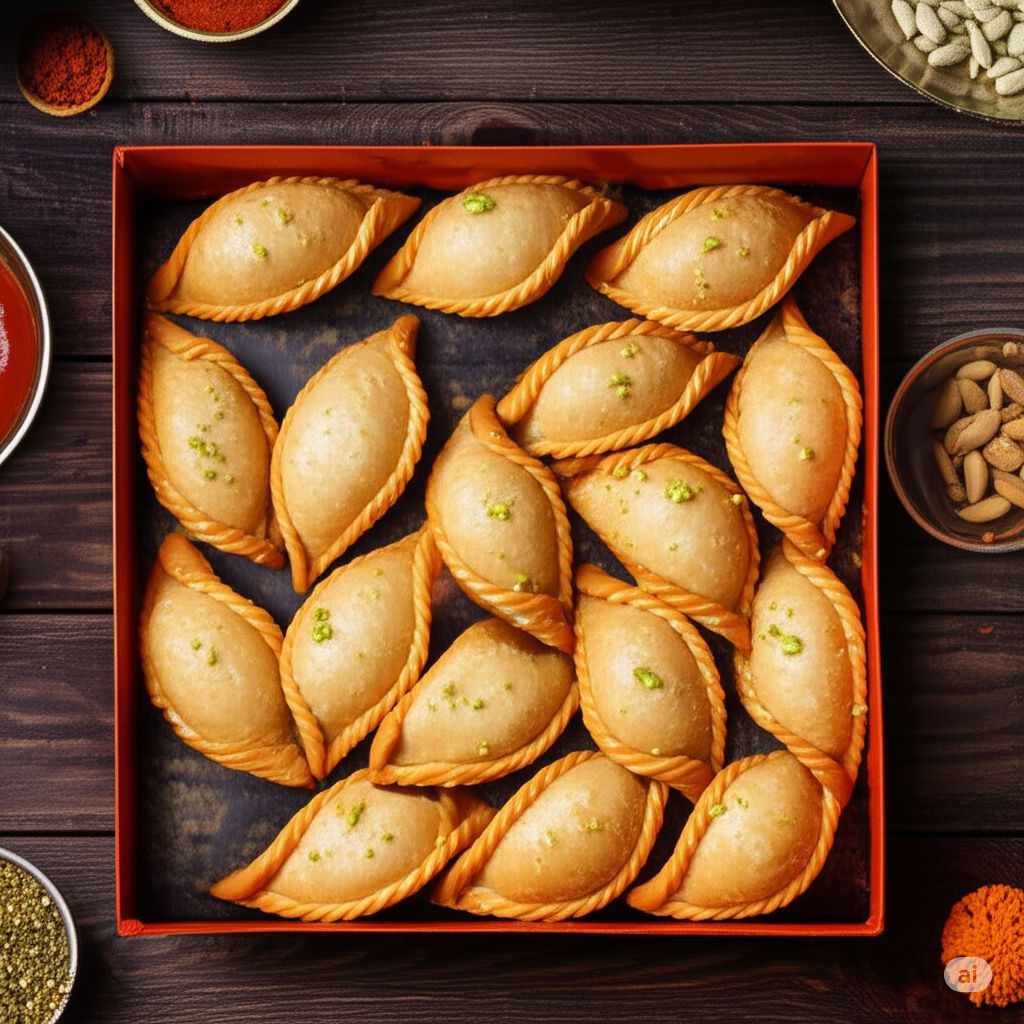 Delight in the festive charm of our Gujiya, a golden, crescent-shaped pastry filled with a luscious blend of khoya, dry fruits, and coconut. Each piece is hand-crafted and gently fried to a perfect crisp, offering a rich, traditional flavor with every bite. Whether for celebrations or sweet cravings, Gujiya brings you the warmth of homemade goodness and the joy of timeless Indian sweets.